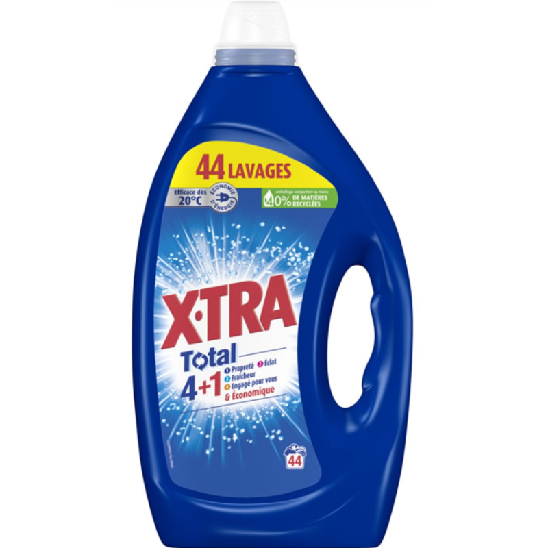 X·TRA Total 4+1, c'est une seule lessive pour tous les textiles, à toute température. Sa formule vous assure un blanc lumineux et des couleurs éclatantes lavage après lavage. Pour un linge impeccable, toujours à prix X•TRA !Une seule lessive pour tout votre linge, à toute température.Efficace même à froid.La lessive n°1 en France* et toujours à prix X•TRA !Bouteille recyclable